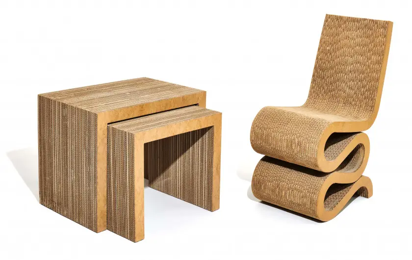 L’une des contributions les plus marquantes de Frank Gehry dans le domaine du design de meubles est sa série de meubles en carton intitulée Easy Edges, conçue entre 1969 et 1979. À une époque où le carton n’était pas considéré comme un matériau traditionnellement utilisé dans le mobilier, Gehry a fait preuve d’audace en l’explorant comme une nouvelle possibilité pour la création de pièces de design innovantes.